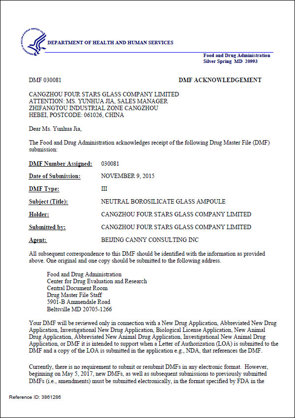 DMF西林瓶認證證書